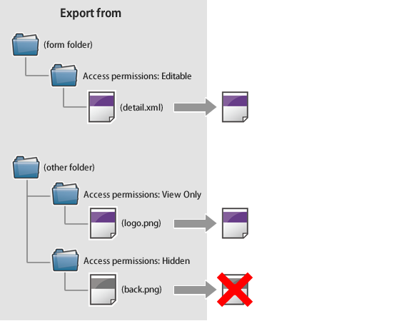 For example, suppose the folder structure and access permissions for the form layout "Detail.xml" and the image files "logo.png" and "back.png" used in the form layout are as shown in the figure below. In this state, if you export "Detail.xml", "Details.xml" and "logo.png" will be exported, but "back.png" will not be exported.