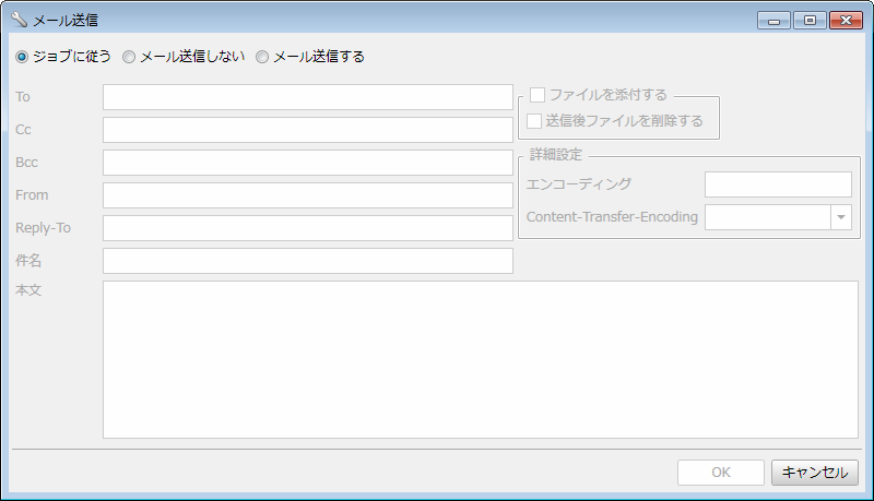 メール送信(*1) | 生成された出力ファイルをメールで送信できます。 ![]() [置換マスター]-メール送信 デフォルトでは[ジョブに従う]にチェックが付いています。 [動作設定]の[メール設定]から内容を変更したい場合は、[メール送信する]にチェックを付けて任意の設定をします。 |